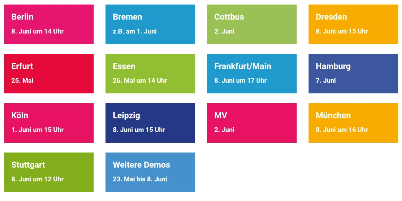 Mit Demos vom 23. Mai bis 8. Juni 2024 im ganzen Land