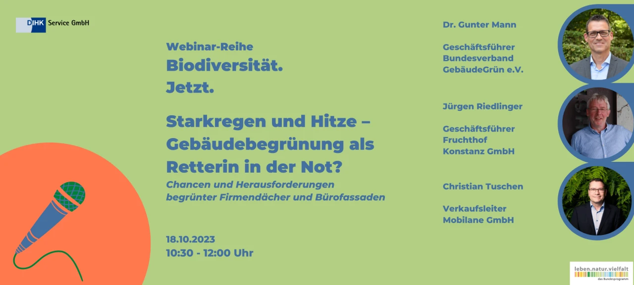 Im Webinar Starkregen und Hitze – Gebäudebegrünung als Retterin in der Not? werden diese Fragen mit Dr. Gunter Mann Geschäftsführer vom Bundesverband GebäudeGrün e. V. und Unternehmer Jürgen Riedlinger vom Fruchthof Konstanz besprochen. Jürgen Riedlinger berichtet dabei über seine 20 Jahre währenden Erfahrungen mit immerhin über 50 Bäumen und wildem Wein auf dem Dach des Fruchthofes.